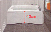 安全で快適なバスルームへの気配りです。 1. 浴槽またぎが高さが低く、腰掛けスペース付き またぎ高さが低いので、浴槽への出入りがラクに行え安心です。 ![]() ![]() 2. 出入り口段差2cm以下(マンション用のご提案) 洗い場との段差をおさえ、出入りの際のつまずきを防ぎます。洗い場床面は滑りにくい岩肌仕上げとなっています。